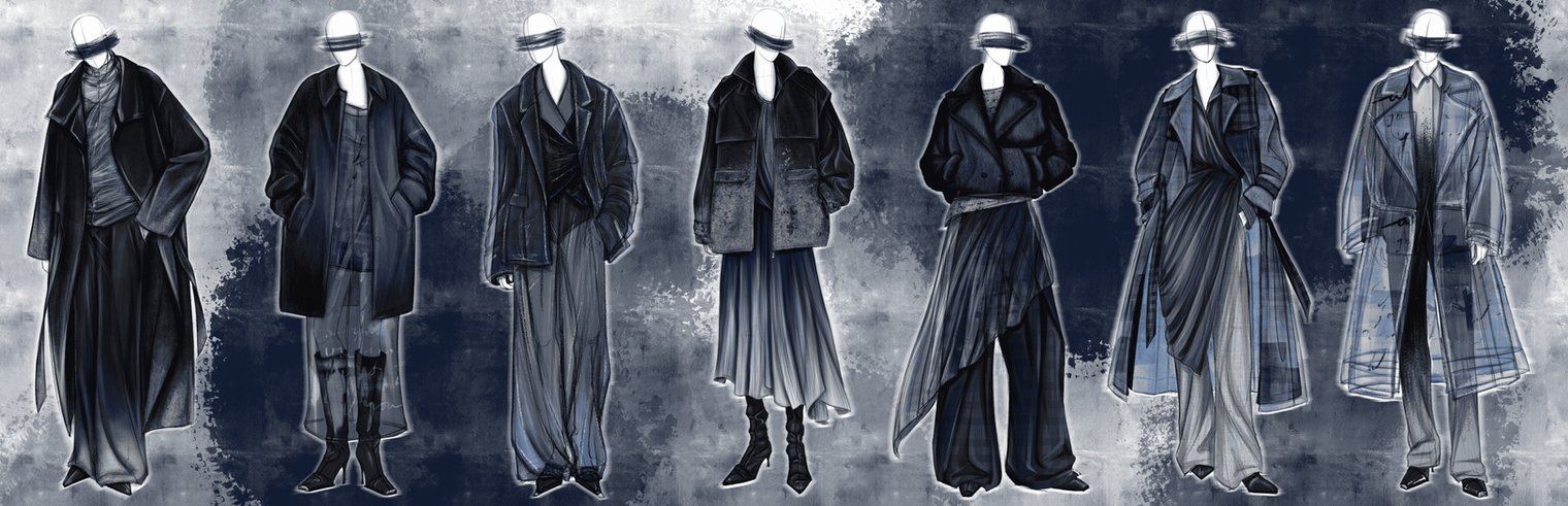 nkFlow is a womenswear collection that treats rain as an emotional atmosphere rather than a physical condition. Using wool coating and suiting, chiffon, and organza, the garments explore opacity and transparency through layered construction and atmospheric printed textiles. Developed for the Joe’s Blackbook scholarship, the project focuses on how material, print, and silhouette can express quiet emotion, movement, and the sensory experience of rain.
